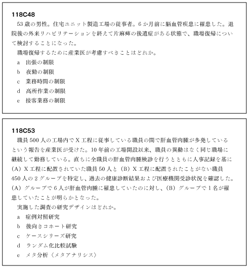 産業医分野からの出題もより実践的になってきている。C48(片麻痺の職場復帰)は産業医として復帰時面談で考慮することで実践的な問題である。C53(調査の研究デザイン)でも、実際の状況が提示されており、ただ単に調査研究を問われていることよりもより臨床的になっている。