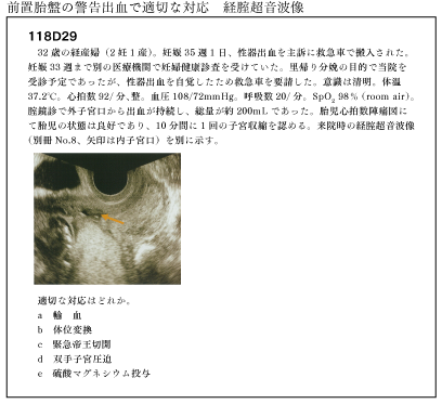 そして前置胎盤の警告出血系の問題は 112B30で物議を醸し、 117C59で落ち着いたようにも見えましたが、今年も D29で出題されました。受験生の正答率に注目が集まります。