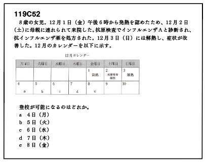 小学生以上なのかによっても異なり、また文章では理解していても実際の状況から判断できるかを問いた良問である。患者さんのお母さんから「何日から学校に行って良いですか?」で訊かれることは日常診療ではよくあることだ。