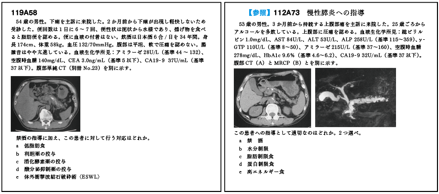 A58(慢性膵炎への対応)では、慢性膵炎の診断をすることは容易であったが、その対応が難しかった。慢性膵炎への指導では過去問(112A73)に既出で、その時の正解が『禁煙』と『脂肪制限食』であった。では今回も『低脂肪食』を選べば良いかと言うと、この症例では過去問と違いアミラーゼ値が低値を示していた(112A73:Amy215U/L)ことを見逃してはいけない。この症例は非代償期の慢性膵炎と考えられ、腹痛も訴えていないため脂肪制限は行わず、消化酵素薬の投与が正解となる。