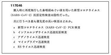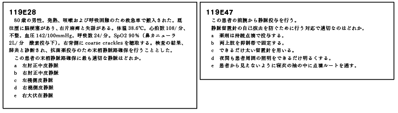 E47(確保した点滴ルートを自己抜去されないよう固定する方法の問題)も非常に臨床的であった。臨床現場ではコメディカル(看護師さんなど)がいろいろと工夫してくれている。高齢の入院患者さんの多くなっているため、受験生もいずれ自己抜去には泣かされることがあるだろう。皆さんもいろいろ工夫してみてほしい。
