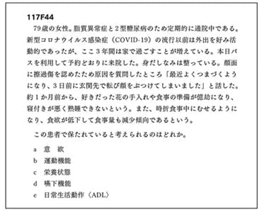 やはりという感じだが、新型コロナウイルス感染症関連の問題が何問か出題された。 E46では、「実際の救急外来の診察手順」、F44は「新型コロナウイルス感染症流行による高齢者への影響」と非常に臨床的な問題でともに良問だ。難易度も特に問題なく答えられるものであった。