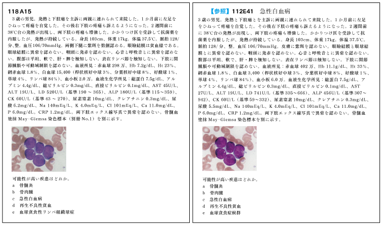 例えば、 116A23は 112A16できちんと見ていれば細胞質にアズール顆粒、Auer小体を認める細胞の増加を認めることから『急性前骨髄球性白血病(APL)』であることがわかるので、治療法を聞いている問題は瞬殺であった。