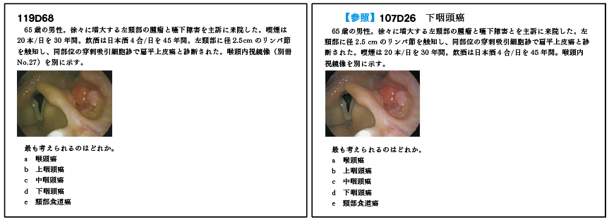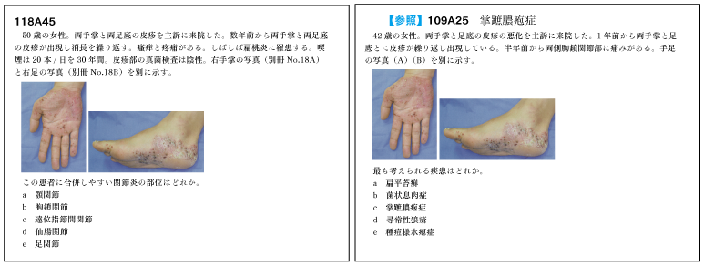 毎年のことだが119回の画像問題でも過去問と同じ画像が多く認められた。119回も問題文の文章、データなど全て過去問と同じ問題もあり(119A63と110D25【仙腸関節炎】。119D64と112D39【若年性特発性関節炎〈JIA〉】。119D68と107D26【下咽頭癌】)過去問学習の大切さを今一度確認できることとなった。