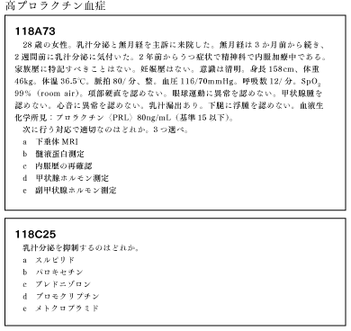 ②に関して、個人的には114C34を間違えた。女性化乳房は女性ホルモン/男性ホルモン比が上昇して生じるため、肝硬変(女ホ↑)と精巣腫瘍(男ホ↓)は良いが、もうひとつをドパミン受容体拮抗薬でなくACTH単独欠損症を選んでしまった。PRLに関しては「PRL↑↑→ GnRH↓→ ゴナドトロピン↓→男ホ↓」というくらい、PRL ↑↑がないと、女性化乳房は認めない [2]。それが頭にあったことと、ドーパミンがPRLを抑制することは自ら論文に書いている(甲状腺癌が女性に多い理由とPRLの関係について [3] )のに失念していた。「ACTH↓ → 副腎刺激↓→ 男性ホ↓」を優先したからだが、思い返してみれば授業で自ら「男性の男ホのうち副腎由来はわずか5%」と言っていたのに忘れていた。こうした誤りは、試験を解いている自分、論文を書いている自分、講義している自分が乖離していることが原因であり、自己同一性を保持するためにも情報を一元化することが望ましい。一つの予備校についていくとか、あちこちの媒体をつまみ食いするなら自分のまとめノートに情報を一元化するなど。