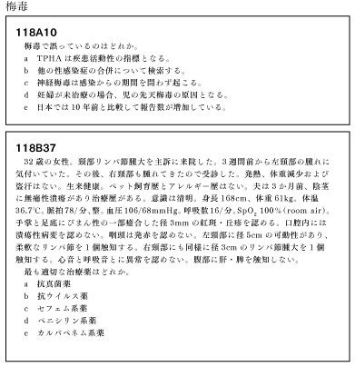 117回も、「まず、行うものはどれか?」「次に行うものはどれか?」、「さらに行うものはどれか?」などと聞かれている問題が多かった。116回同様、これらの問題が約30問あった。 机上の勉強だけではなかなか対策が難しいこれらのタイプの問題対策としては、臨床問題を解いているときに具体的に問題に登場した患者さんを想像することだろう。臨床問題を解くごとに、新しい患者さんが目の前に現れて、診療・治療をイメージの中で行うことができれば最高である。実際に目の前に苦しんでいる患者さんを、いかにしたら救うことができるか?そこを考える力が必要なのである。