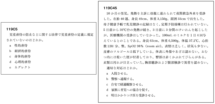 小児科はオーソドックスな問題が多かった印象がある。最近流行りの乳幼児の正常所見・異常所見・循環不全を疑う所見などは今年も出題された。そしてやはり感染症系からも複数問、出席停止基準やリンパ節が腫れる疾患などが狙われた。虐待に関しては違う観点から出題された。