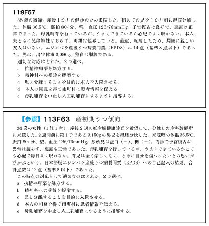 その一方で周産期に関しては助産師国試のような細かい分娩経過を問う問題もあり、GBS陽性妊婦の対応など新作もみられた。 労働基準法だけではなく育児休暇や就労について、さらに死産届に関してなど公衆衛生的な切り口でも新作がみられた。