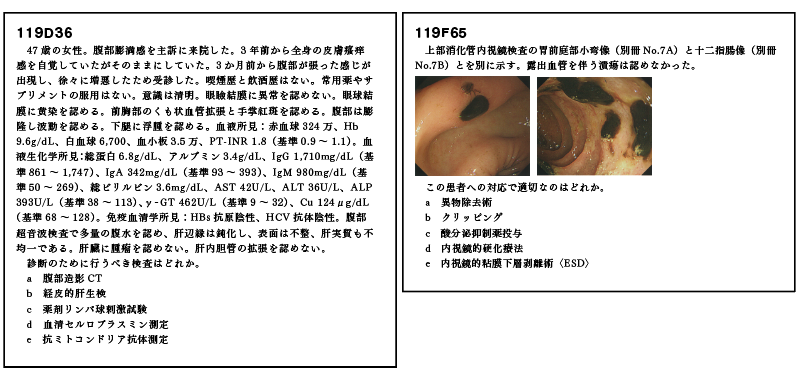その他、D36(原発性胆汁性胆管炎)の診断でも問題文の症例では腹水貯留のため肝生検はできないこと、F65(胃・十二指腸潰瘍)の対応でも問題文の症例では露出血管がないためクリッピングは行わないなど。提示された症例を具体的に評価し、その状況にあった対応を選択する必要があり、これらはなかなか難問であった。より一層、深い勉強が必要ということではある。