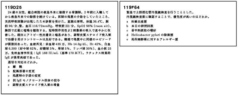 D25(手技時に着用する手袋でのラテックスアレルギー)もまま経験することである。検査室や外来には必ずラテックスフリーの手袋が置いてある。患者さんに検査前にアレルギーの有無を確認することも重要である。局所麻酔薬(キシロカインなど)やラテックスなどへのアレルギーの有無を問うことも重要でF64でも出題されていた。