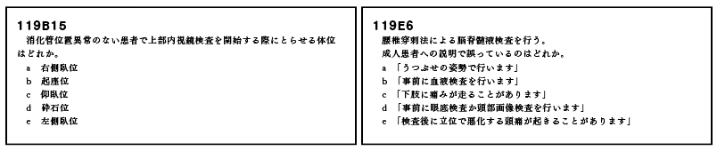 検査の体位など、ちょっと盲点となる分野も出題されていた。B15(上部消化器内視鏡検査の体位)やE6(腰椎穿刺法)である。臨床では当たり前のことだが、検査に立ち会うことが学生時代は少ないと思うので、今一度確認しておいてほしい。ちなみに下部消化器内視鏡検査も左側臥位である。
