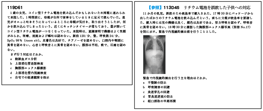 また、画像診断の学習から、行うべき検査を問われた問題の正解を導くこともできるようになる。D61(リチウム電池を誤嚥した子供への対応)は、113D45で印象的な胸部エックス線画像を学んでいれば容易に解答を得ることができたはずだ。