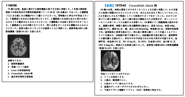例えば、119D56は107D42と酷似したCreutzfeldt-Jakob病のMRI画像が出題された。大脳皮質に沿った広範な高信号域を認め、Creutzfeldt-Jakob病に特徴的な画像であったが、過去問学習時に他脳疾患のMRI画像もまとめてみると良いだろう。Wernicke脳症(110I22、103I52)や単純ヘルペス脳炎(101A47、110A22)などMRI画像で特徴的な高信号域を認める脳疾患がある。それらをまとめて学習することで、脳疾患のMRI画像問題は得意分野となるだろう。
