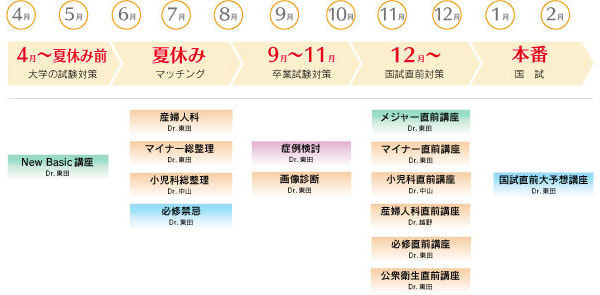内科、小児科、産婦人科、マイナーについての「直前講座」を受講しました。この頃になると、東田先生の講義形式にもグンと慣れ、先生が話される一つ一つが知識の確認作業となり、先生が話される一つ一つを理解しなければならなかった時期に比べてずっと負担が減りました。良い問題は何度もテキストで扱われるので、嫌でも、問題に対する考え方を理解できるようになり、自信も生まれてきました。実際、模試の成績もかなり良くなりました。また、直前講座では、次回の国家試験の傾向を予想しながら講義がすすめられました。このような対策は自力ではほとんど不可能ですし、実際先生の予想はかなり的中しましたので、是非受講して下さい。