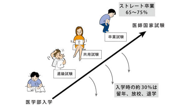 医学部に入学して6年間ストレートで卒業できる人は全体の65〜75%です。残りの約30%の学生は6年間のどこかでつまづき、留年あるいは放校になってしまっているのが実態です。