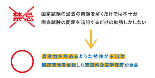 大学の進級試験や卒業試験では短期記憶に頼った暗記のみの勉強をしている学生が多いので、十分留意しないと国家試験には対応できません。現在の医師国家試験は毎年質的に変化しており、知識だけで解ける問題から理解・思考力を必要とする問題の割合が増えています。