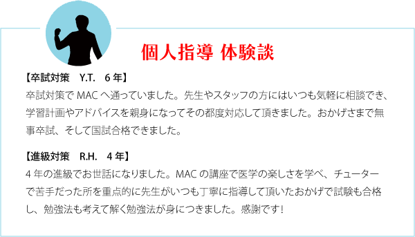 MACではこれまで多くの学生さんを進級・卒試合格・復学、そして国試合格をサポートしてきました。MACの個別指導は医学部低学年の学生さんから既卒生の学生さんまで対応しております。個人指導を希望される方は、講師、スタッフと十分に面談を行い目標に向けて進めて参ります。